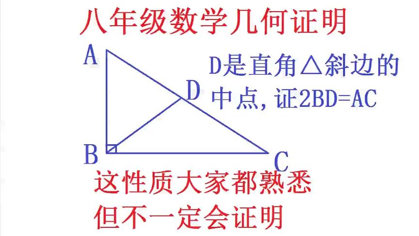初中数学 直角三角形斜边中线定理的证明 一种相对简单的方法 已知 Abc是一个直角三角形 Ab D是ac中点 求证 1 2ac 海燕数学 哔哩哔哩
